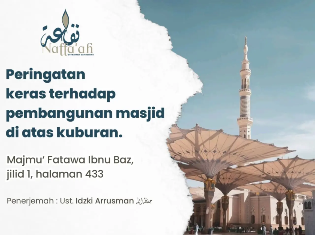 Dan termasuk keindahan syariat Islam adalah larangan dan peringatan keras terhadap pembangunan atau mendirikan masjid di atas makam, sebagaimana yang diriwayatkan oleh dua imam besar, Al-Bukhārī dan Muslim, rahimahumā Allah, dari Aisyah radhiyallāhu ‘anhā, ia berkata: